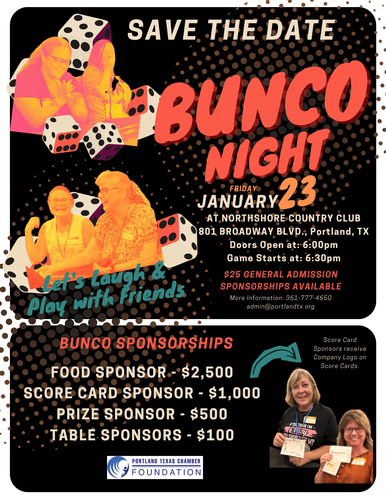 This isn’t just a game night – it’s an opportunity to come together and make a difference! All proceeds from the evening will support the Portland Texas Chamber Foundation. Whether you’re a seasoned player or new to Bunco, this event is open to everyone, and we’ll teach you everything you need to know.